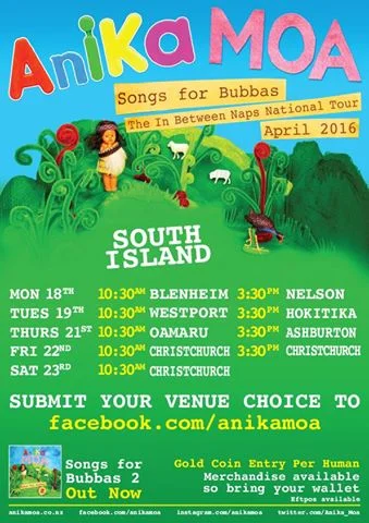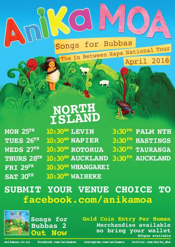 With its production funded by a Pledge Me campaign, Songs for Bubbas 2 follows on the runaway success of Anika’s first ‘Bubbas’ album and is scheduled for release on April 8. Meeting her fans with the 18-stop tour, Anika is running things differently. She’s using the power of her wide social media network to alert fans where she’ll be performing at co-arranged venues such as libraries, schools, kindergartens – and even the homes of fans.