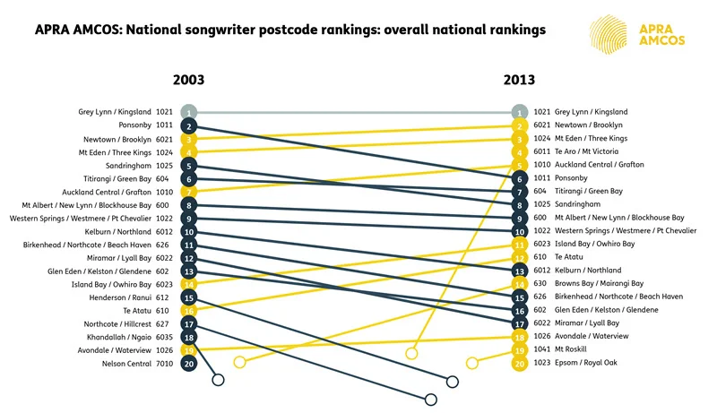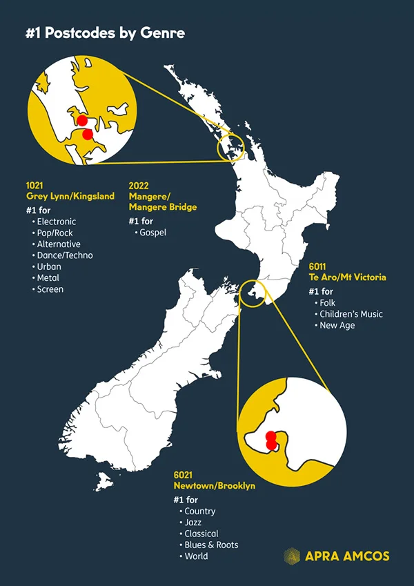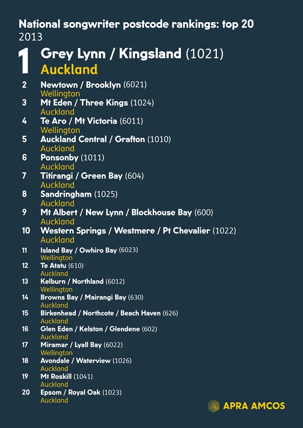 APRA AMCOS has released national rankings of the top song writing postcodes in New Zealand, based on the number of earning APRAsongwriters by postcode. The report finds that Auckland's Grey Lynn / Kingsland is the number one spot in the country for songwriters, which has retained first place for the highest number of earning songwriters in a postcode since 2003.