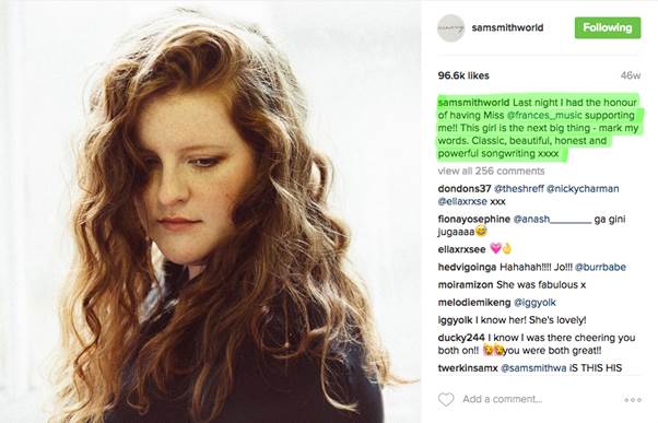 In her short time in London since moving from her Berkshire home in England’s south-east, Frances has found herself in sessions with acclaimed pop songwriters including Grammy and Oscar winner Jimmy Napes (Sam Smith, Disclosure, Mary J. Blige), Greg Kurstin (Adele’s ‘Hello’, Beck, Sia) and Jonny Latimer (Ellie Goulding, James Bay).