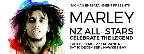 Marley - NZ All-Stars Celebrate The Legend will be staged at Wharepai Domain, Tauranga, on Friday 9 December and Black Barn Vineyard, Havelock North, on Saturday 10 December.