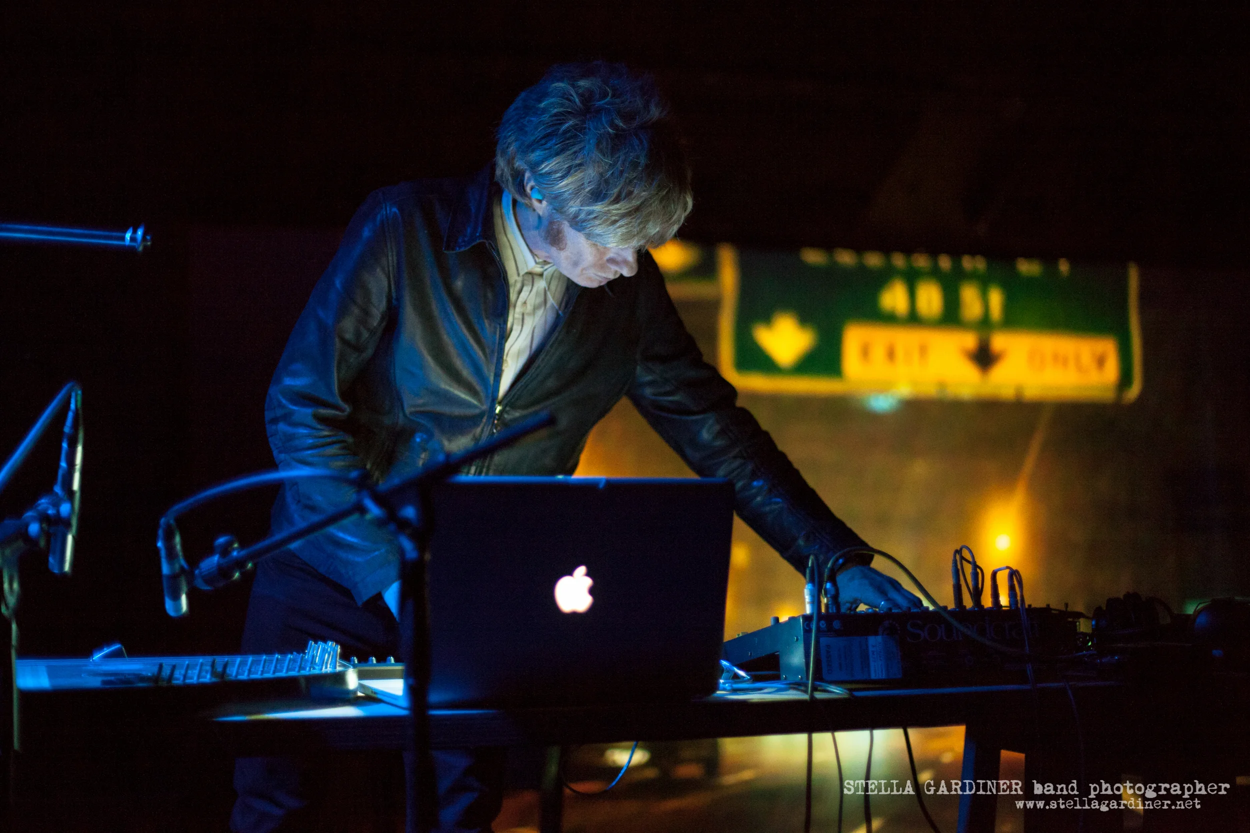 J.G Thirlwell slinks onto the stage just after 10pm. totally cool and completely focused; he certainly looks like someone who has been making music in one form or another for 30 odd years. Experience with different instruments and musical genres ranging from cathartic noise-rock to abstract electronics just oozes from the performance, which is full of improvisation and spontaneity. Carefully positioned off-centre in front of night light visuals projected on a screen at the back of the stage, Thirlwell is lit in dark blue light, befitting a man who appears as thought he is secretly performing an imaginary cinema soundtrack. His sounds are both complex and primal, sometimes incorporating recognisable instruments like an old violin bow, a beautiful bell and a triangle. But there are technical elements of which are beyond my comprehension and I feel like a child in some ways, fascinated by this new experience.