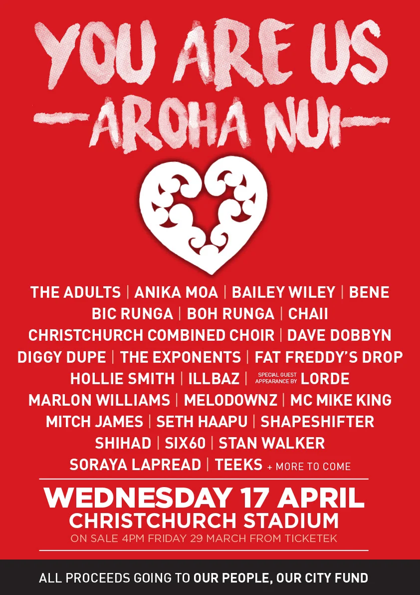 YOU ARE US/AROHA NUI could not be put together at such short notice on this large scale without the help of multiple people and organisations within New Zealand. In an effort to donate the full proceeds from ticket sales many are giving their time and equipment at no cost. Ticket booking fees will also be donated for these events.