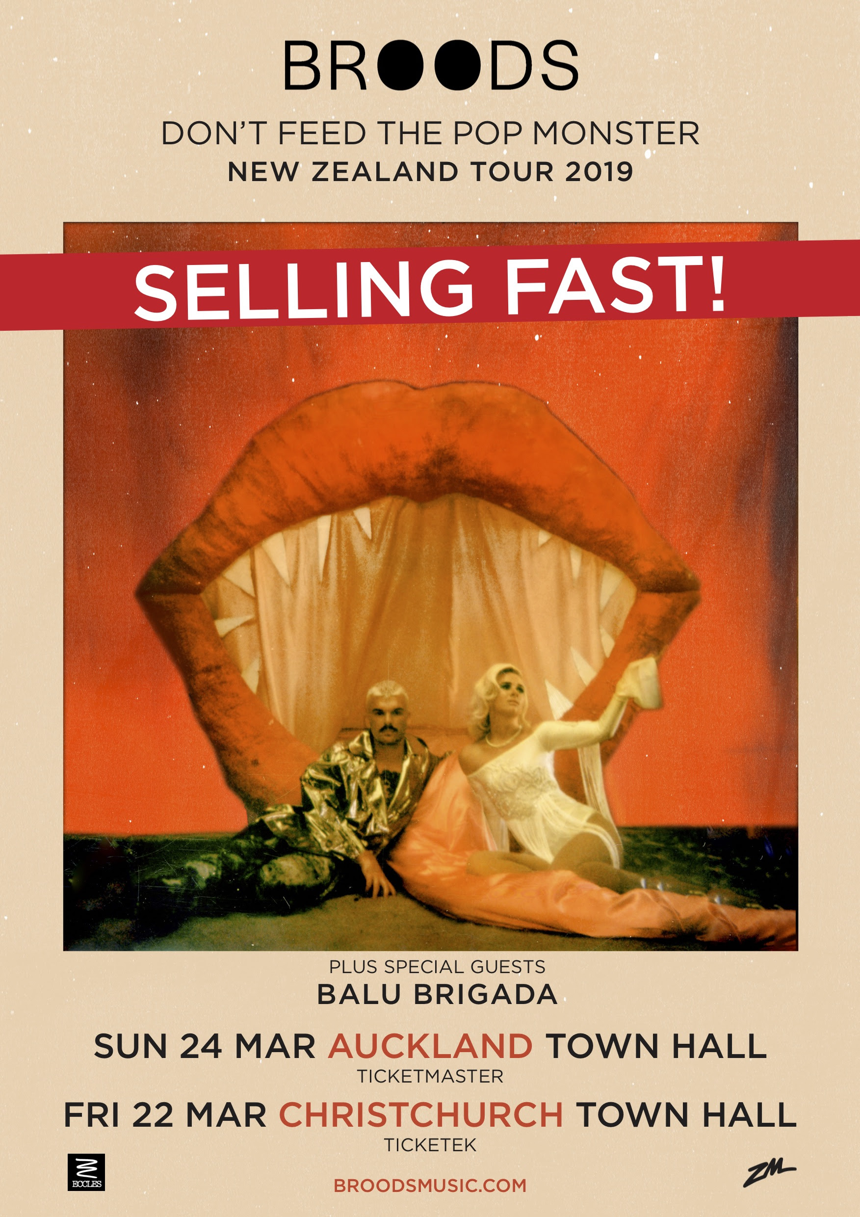 BROODS’ DON’T FEED THE POP MONSTER tour is the first time in more than two years that the LA-based duo has played consecutive shows on home soil. And they’re excited to have up-and-coming Kiwi band Balu Brigada opening for them.