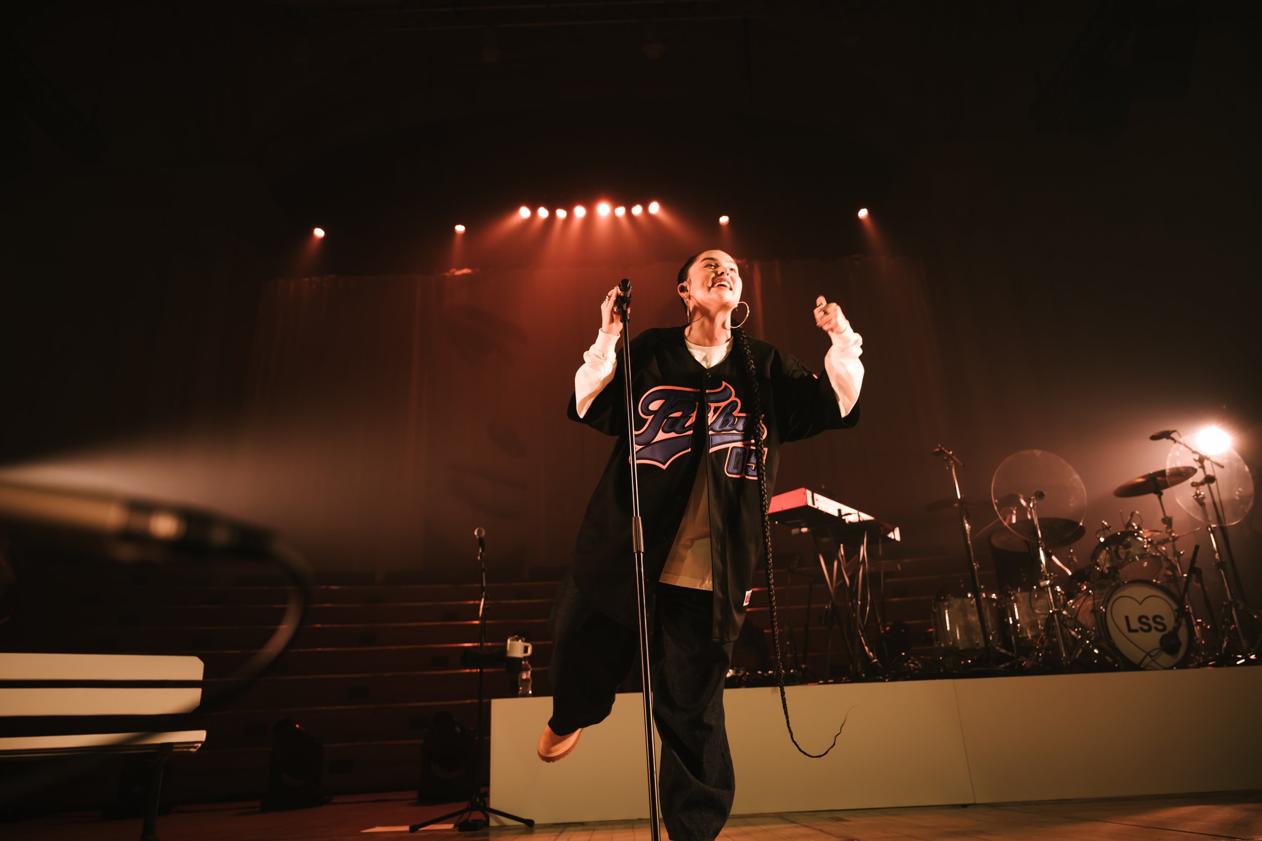 She sat down cross-legged on the park seat as she performed her song Small, while the lighting became dimmed throughout the venue, and a stage light pointed on her, with a soft white glow around the stage, giving off a sad lonely feeling, while the audience swayed to the slow melody.