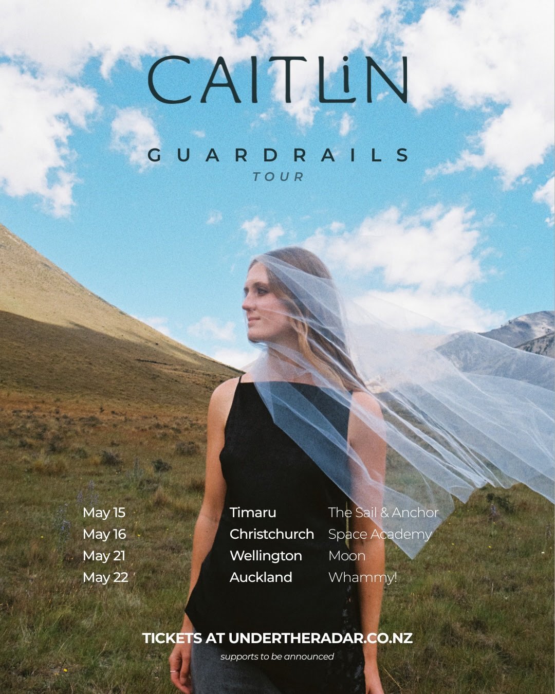 This announcement comes fresh from her appearance on the Electric Avenue main stage this summer. Caitlin will take the Guardrails EP on the road with a four-date national tour across Aotearoa this May. “The energy at Electric Avenue was incredible,” Caitlin says. “I loved seeing the songs from Guardrails connect with people in the crowd. I can’t wait to bring this special show around the country in May, once the full EP is out.”
