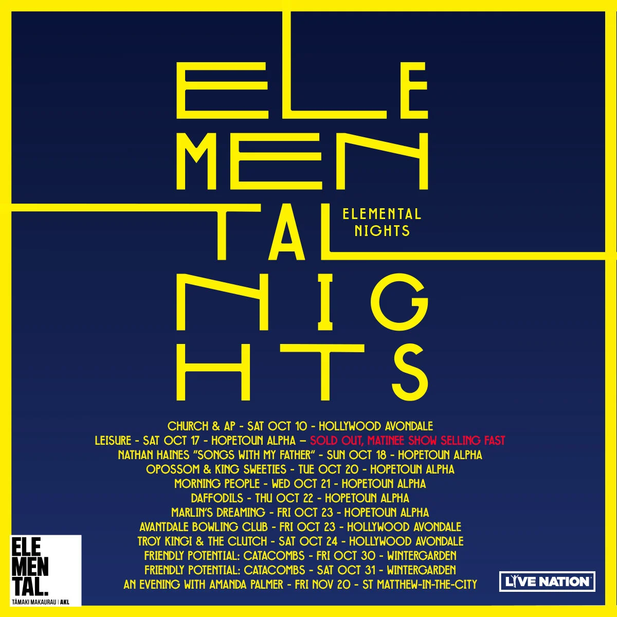 Unique to Elemental AKL, Elemental Nights is an exclusive curated concert series showcasing an impressive line-up of emerging and high-profile local artists.