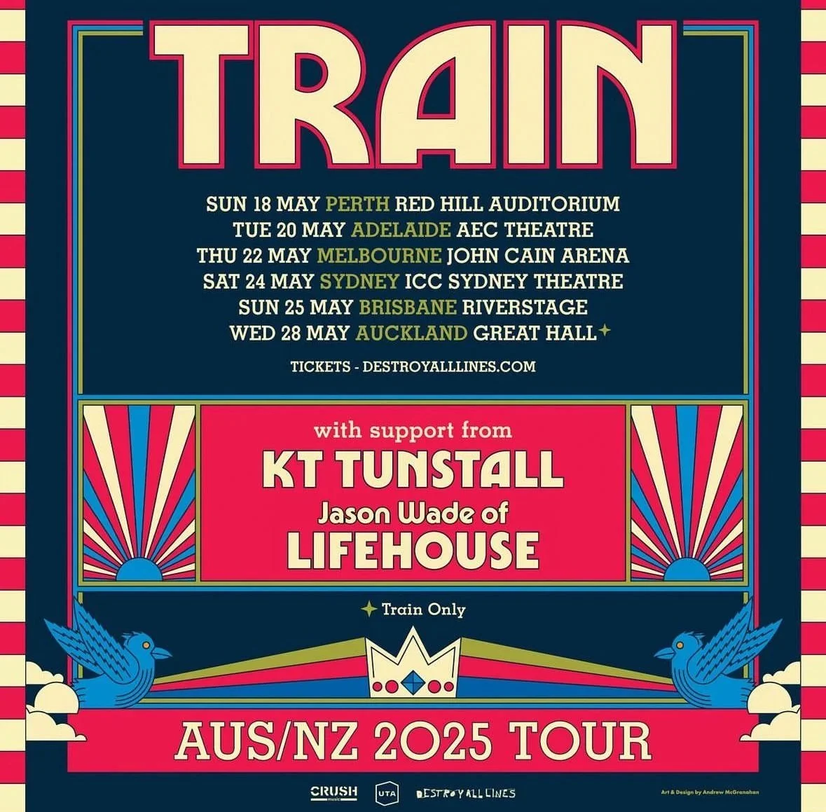 Train’s highly anticipated 2025 Australasian Tour will bring fans across the globe an epic night of music filled with the band’s most iconic, chart-topping hits including ARIA 15x platinum certified, #1 best-selling smash “Hey, Soul Sister,” ARIA 12x platinum certified, double-GRAMMY-winning breakout song “Drops of Jupiter,” ARIA 2x platinum certified tracks “Drive By” and “Play That Song,” and many more from their critically-acclaimed catalog spanning three decades.